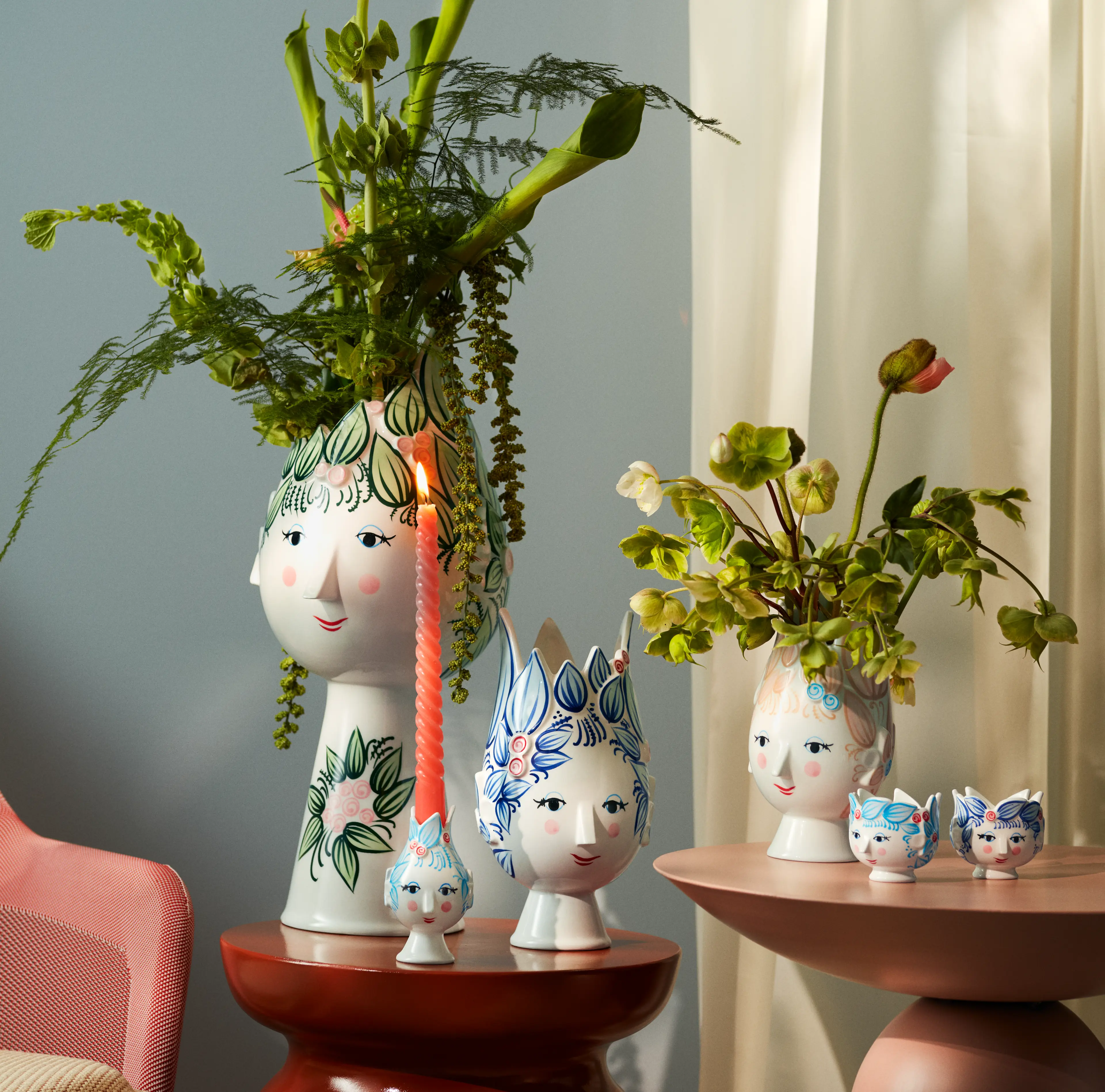 Inbjud den nya damen med hatt in för att njuta av hennes sofistikerade sällskap. Med sina vackra färger, udda detaljer och handmålade dekorationer kommer Lady with hat-serien garanterat att skänka glädje till ditt hem. Hon kan tyvärr inte skaka hand med dig eftersom hon använder båda händerna för att balansera hatten – och blomman, buketten eller ljuset du placerar i den.